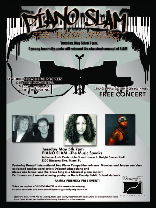 In the spring of 2009, Deborah co-founded with The Dranoff 2 Piano Foundation Piano Slam, a classical performance and education program, one of the Adrienne Arsht Center for the Performing Arts of Miami Dade County community signature outreach programs. Piano Slam hosts an annual poetry and Spoken Word competition throughout title one Miami-Dade County middle and high schools. Not only did she produce and direct Piano Slam in 2009 and 2010, but she went on to become Piano Slams Education and Community Outreach Director from 2016-2021 coordinating school tours, field trips, writing workshops and show rehearsals impacting over 2500 students. The program culminates with a performance by poetry contest finalists accompanied by renowned pianists such as the internationally renowned piano duo Jeroen & Maarten Van Veen and the Wang sisters at the John S. and James L. Knight Music Hall in Miami, FL.